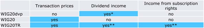 The table below provides a comparison of WIG20dvp, WIG20, and WIG20TR. The table presents the data used to calculate the indices.